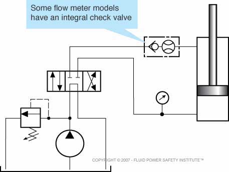| Case In Point A mechanic, with no formal training in hydraulics, was asked by his supervisor to determine why the bucket on the companys front-end loader was drifting down. Although he had never personally used a flow meter, he had, during the course of his career, seen a person use one to test a pump. He found an inline flow meter lying on a shelf so he cleaned it off and installed the adaptors he needed to install the flow meter in the transmission line at the most accessible point the rod-end of the cylinder (Figure 1). He had no idea (only the part number reflected the fact) that the flow meter was designed to permit flow in one direction only. NOTE: Flow meter manufacturers (in-line type) generally do a poor job of indicating whether a flow meter is a uni-directional type or a bi-directional type. Once he had installed the flow meter, he asked the operator to start the machine and cycle the cylinder as he observed the flow meter. There was a thunderous explosion as the flow meter burst. Oil discharged from the gaping hole at extreme velocity and pummeled his body. It blew his hard-hat and safety glasses off and filled his eye sockets with hydraulic oil. The operator shut the machine down and rushed to his aid. The mechanic was fortunate in that he did not (this time) suffer a lost time injury. His supervisor, who was as equally ignorant about hydraulic as the mechanic, wrote the failure off as a "defective flow meter." A formal investigation to determine the root cause of the failure was never conducted. In addition a near-miss report was not written about the incident. There is no doubt that training would have prevented this accident. A course in basic hydraulics would have taught the mechanic about force, pressure, and area as it applies to a hydraulic cylinder. He would have learned that a double-acting, single rod hydraulic cylinder is, in addition to being a device which converts fluid energy into linear mechanical energy, a pressure and flow intensifier (Figure 2). Also, he would have learned about the different flow meter designs, and how to properly and safely use them. |